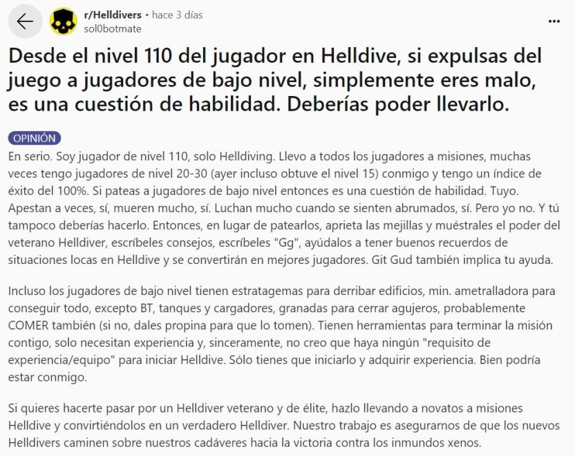 El jugador conocido como «Sol0botmate» ha lanzado una fuerte crítica contra la práctica de expulsar a jugadores de bajo nivel en una publicación reciente en Reddit. En su opinión, la incapacidad de un jugador experimentado para guiar a un principiante a través del juego demuestra una falta de habilidad. De manera contundente, afirma: «SI EXPULSAS A JUGADORES DE BAJO NIVEL DEL JUEGO, SIMPLEMENTE ERES MALO, ES UN PROBLEMA DE HABILIDAD. DEBERÍAS PODER CARREARLOS».